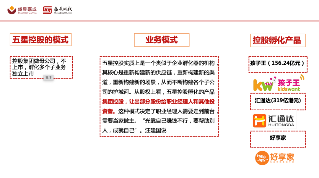 五星控股的前身是“五星电器”,由创始人汪建国于1998年创立,曾经跻身中国家电连锁前三强。2009年,汪建国将五星电器卖给美国百思买,转身设立五星控股,专注进行产业孵化。五星控股以培育新创公司作为他们的主营业务,围绕四类人群——孩子、农民、有钱人、老人,做四个创业方向,先后培育出两家上市公司 “孩子王”(301078)、“汇通达”(HK9878),一家独角兽企业“好享家”,两家瞪羚企业“橙易达”、“阿格拉”等。